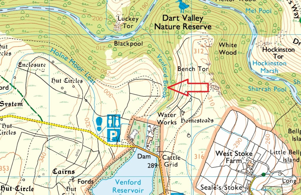 This is a small waterfall, sitting below Venford Reservoir on its outflow. The Venford Brook leaves the dam above on its way to the River Dart, a short distance further down. On its way it passes over a small rocky ledge dropping down a few metres to a small pool below. It the winter and after heavy rain there may be one wider cascade, in summer it is likely to be two small drops either side of a central rock. To get here can involve a steep walk down into the valley first.
