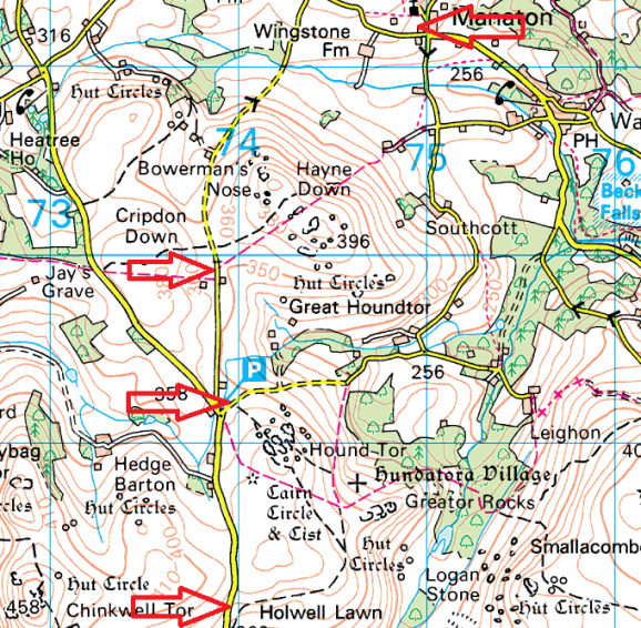 This is an area of parking around the village of Manaton and the area south of the village towards Hound Tor. There are 4 spots on this map, 3 of which are close to Hound Tor and Hayne Down. The one spot to the north is in the village of Manaton, beside the church and cricket pitch. For this one I’d fancy it would be busy on a Sunday morning or cricket day in the summer. Although there are a few spots just out on the road beside the bus stop. The Hound Tor car park is large and will have a refreshment van or ice cream van in attendance, this car park is very busy. The road side spots by Holwell Lawn can also fill up quick. which leaves the area through the gate, roadside under Hayne Down, this is the spot when all others are full, however you can still walk back to Hound Tor easily, north to Easdon Tor and Manaton Rocks or a simple hop up Hayne Down.