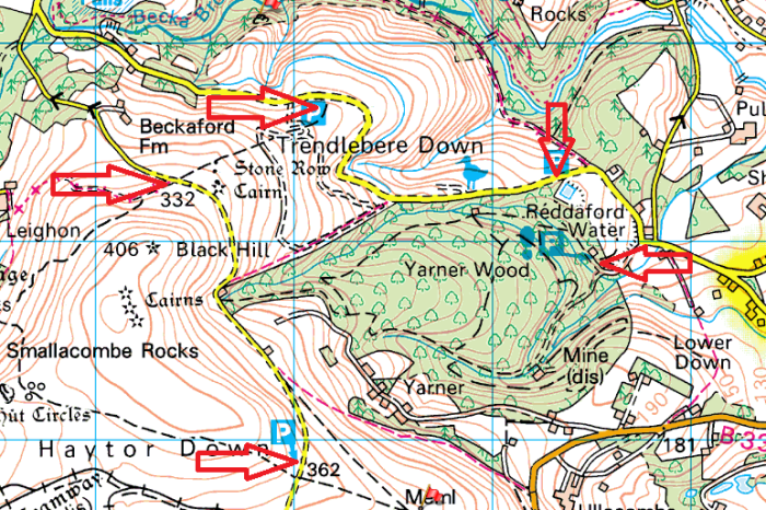 These are a number of spots to park over on the eastern side of Dartmoor, to the northeast of Haytor, on Trendlebere Down. There are more spots than are indicated on my map. Especially on the road to the east that passes Reddaford Reservoir, along this road however is the largest of the spots, with a large car park right in the middle of Trendlebere Down. There are also a number of spots on the higher road under Black Hill which leads to Haytor Down. Altogether these spots provide a decent amount of parking on the edge of the busy area around Haytor and Hound Tor.