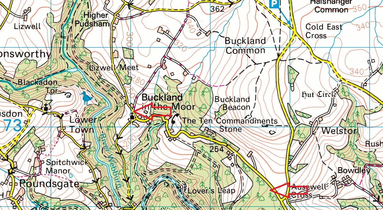 These are a couple of parking spots sandwiched between the Leusdon parking, across the Webburn valley and the Cold East Cross parking, towards Rippon Tor. These two spots are near to the village of Buckland in the Moor. One is a small pull in area near to the church and the other a car park in Ausewell Woods. The first spot could take maybe 3 cars at most (try to avoid the church service times) and the second around a dozen well parked cars can fit in.