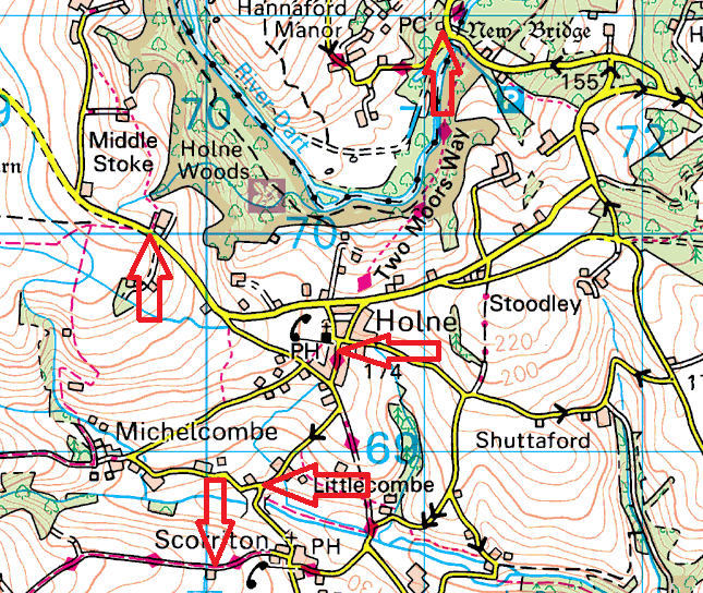 These are a few spots to park, either in the village of Holne or the areas surrounding it. Up at the top of the map is the ever popular New Bridge area, this is now a pay and display car park, normally with an ice cream van or such like. In Holne itself there is a small village hall car park with an honesty box. The lane out of Scoriton becomes a bit rough after the last house so be careful if heading that way, although I have seen normal cars parked up that lane very easily. The spot near to Middle Stoke is the old quarry area as you cross the cattle grid, heading up to Venford Reservoir, this is a good spot for heading along the Sandy Way up towards Ryders Hill.