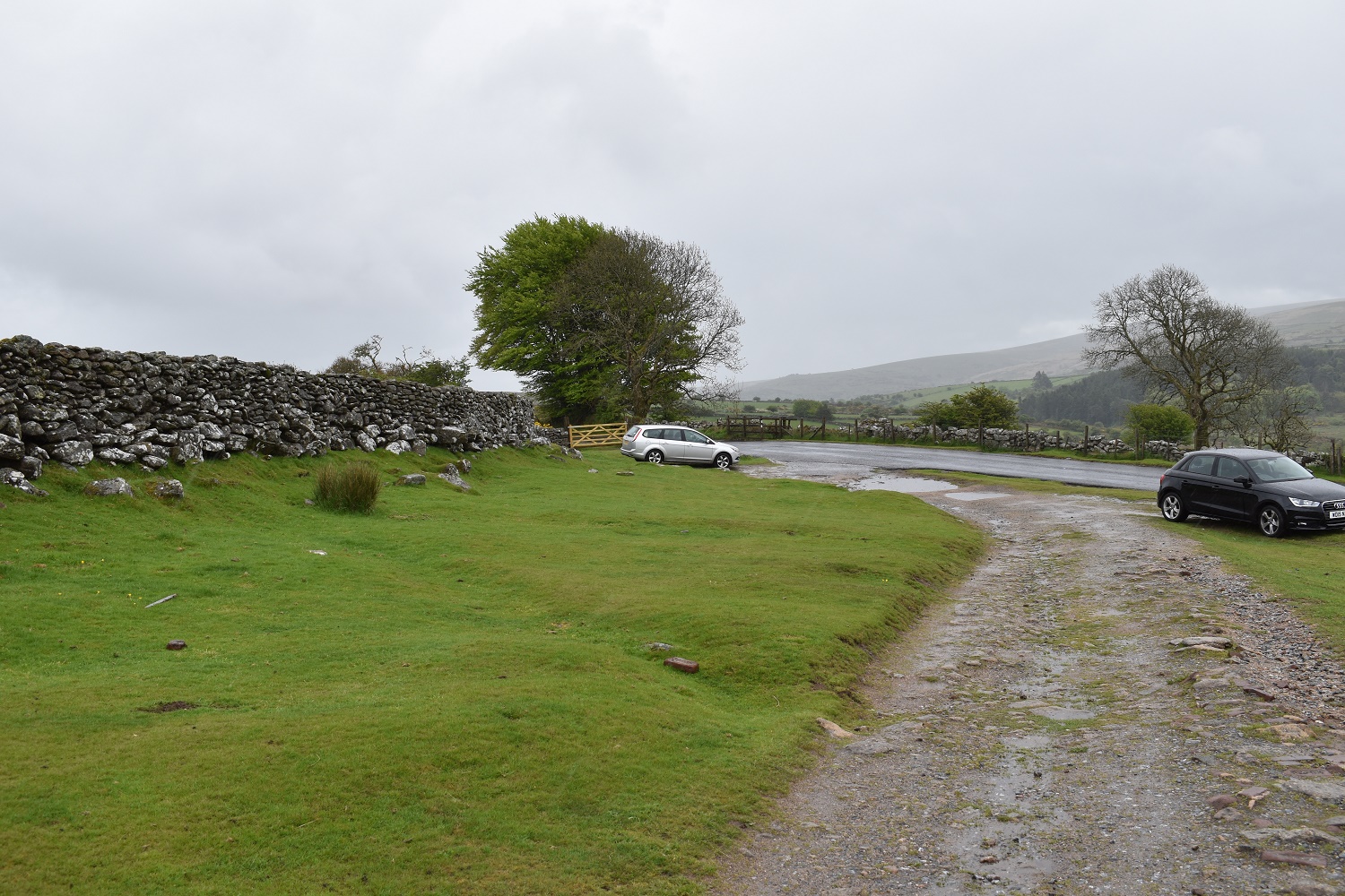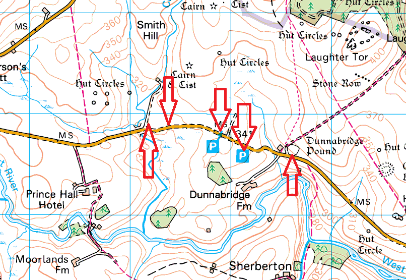 This is a series of around 5 parking spots running from Dunnabridge Pound back towards Two Bridges. Each of the parking spots will take at least 8 cars, although the spot right by Dunnabridge Pound will only take perhaps 3 cars on the grass verge. I’ve never failed to get parked at at least one of these, although it will be rare to find them all empty. There are no parking charges for these currently.