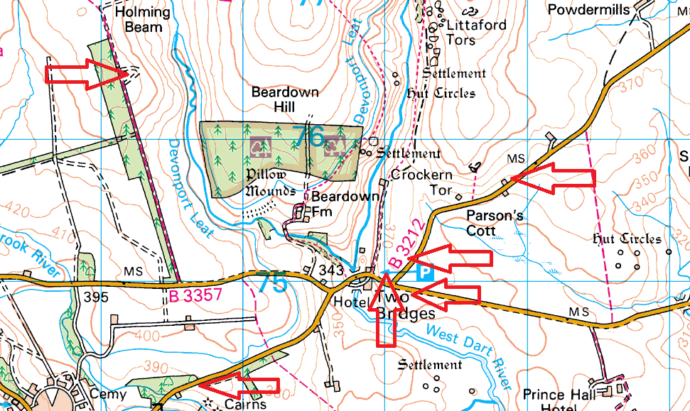 This is a number of parking spots around the popular spot of Two Bridges, famous for its Two Bridges!! On this page there is the decent car park at Holming Beam which can fit around 10 cars, which is the start of the Merrivale firing range and regularly used by the forces. There’s the obvious car park at Two Bridges, opposite the hotel, this holds about 10 cars as well. There is also a small space up the road from Two Bridges which when the main car park is full is a useful addition with another 4 spaces. Then there’s two lots of road side parking, one as you head out on the road towards Dartmeet and the other on the road to Postbridge. Needless to say the busiest of these is the car park opposite the hotel, the Wistman Wood walk from here is very popular. You can also head up to Longaford Tor, Higher White Tor, Beardown Tor or beyond from all these spots or possibly head south towards Prince Hall Rocks.